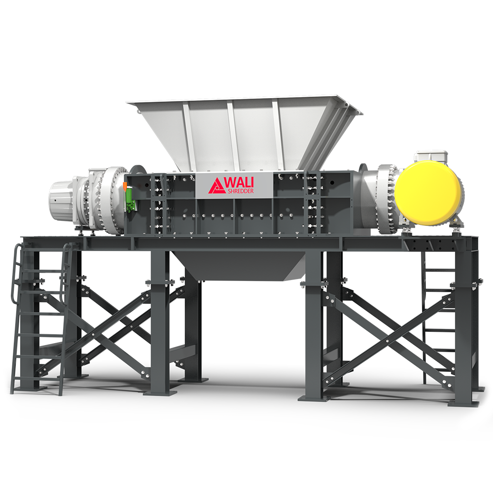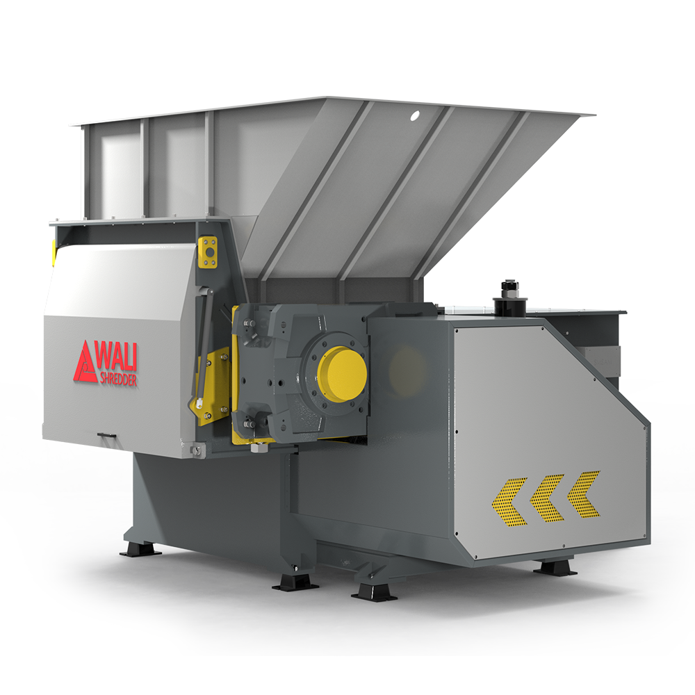 Based on the material, throughput and end usage; WALI offered its WLP twin shaft, slow speed, high torque waste shredder. This particular shredder can be deployed as either a primary or secondary shredder due to its highly robust design, high throughput and superior resistance to difficult to shred material. The twin shaft design provides exceptional intake behaviour, reduces traditional wrapping of material such as wires, plastics and long fibres and lends itself to less wear and longer life expectancy. This combined with impressive design features such as tramp metal cycles and intelligent load sensing insures against asset damage and makes the WALI the ideal solution for the processing of end.
